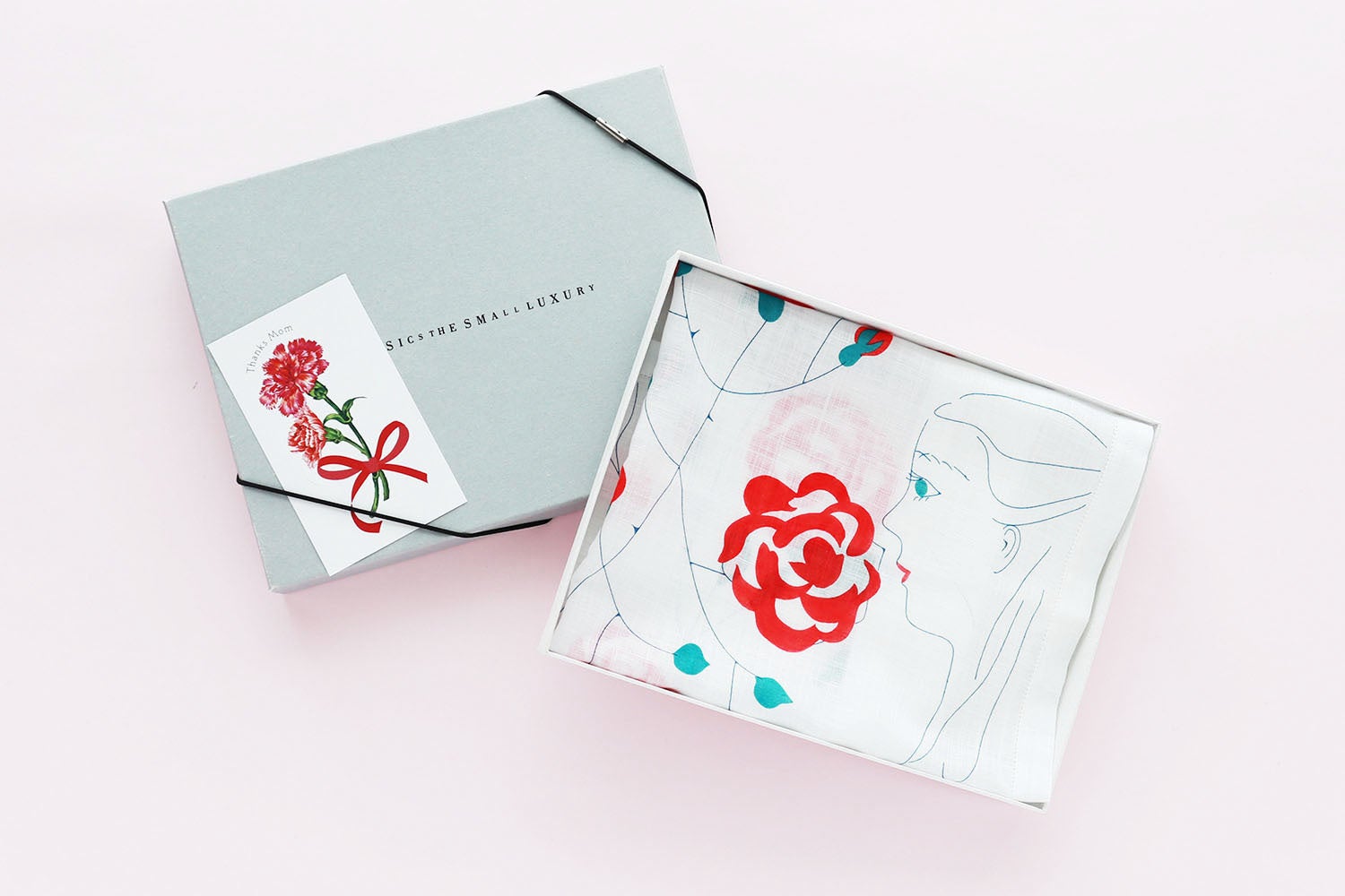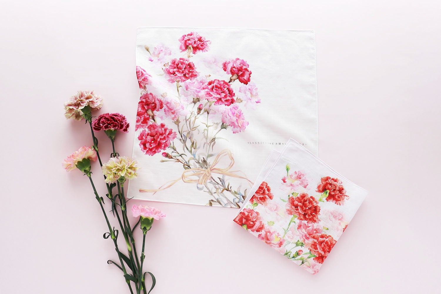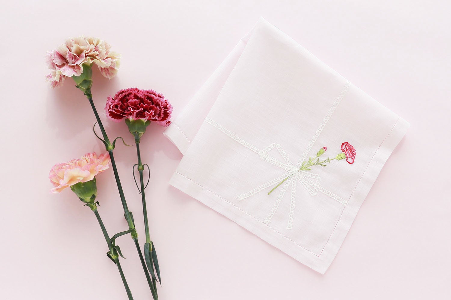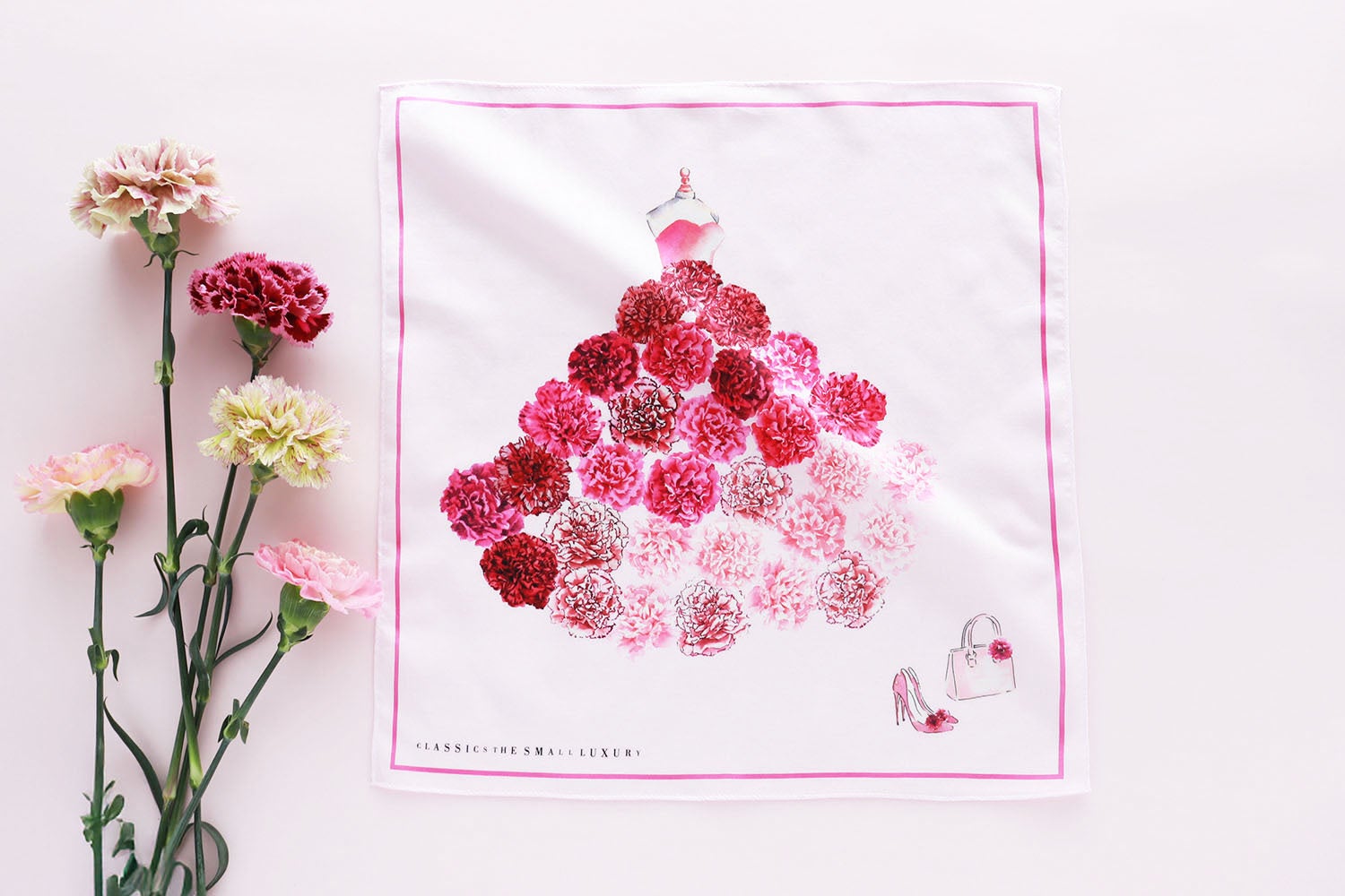 母の日ギフトに、手元に咲く華やかな贈り物。カーネーションのドレスを描いたハンカチーフを発売