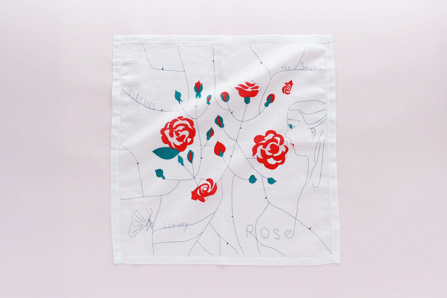 KIGIのアートディレクター/デザイナーの渡邉良重さんによる繊細なラインのイラストを、手捺染プリントで表現しました。咲き誇るバラの花に囲まれ、かぐわしい香りが漂ってきそうなハンカチーフです。