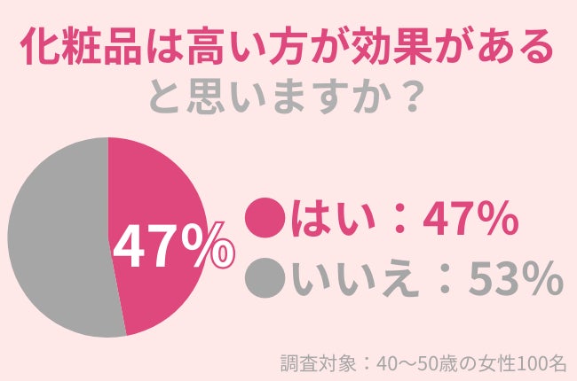 調査の結果、40代女性の47%の方が「化粧品は高い方が効果がある」と思っていることがわかりました。