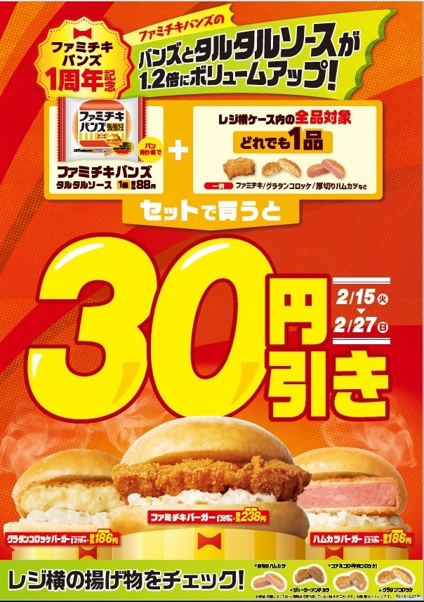 期間中、「ファミチキバンズ(タルタルソース)」と、レジカウンターケース内の対象ホットスナックなどとセットで買うと30円引きで購入できるおトクなセット割引を、全国のファミリーマート店舗で開催いたします。ぜひこの機会にお試しください。