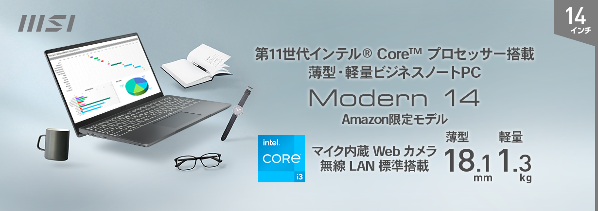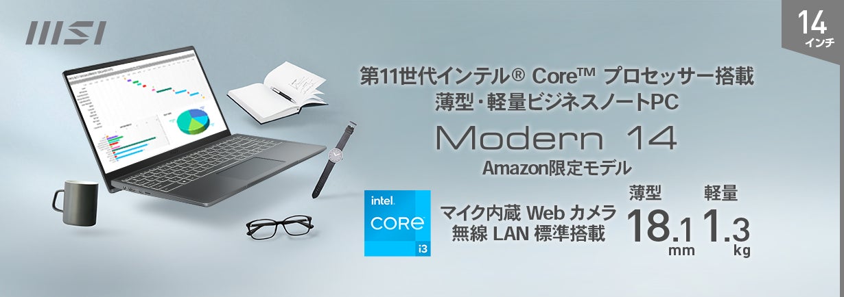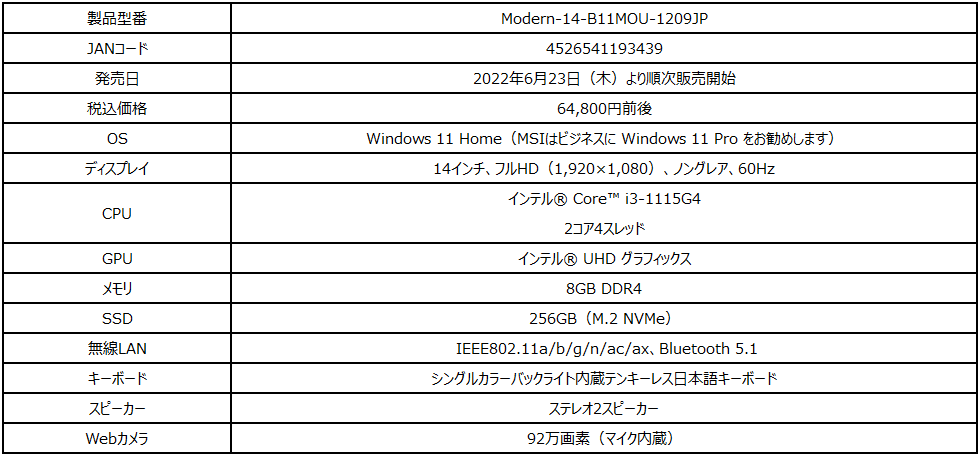 この度、エムエスアイコンピュータージャパン株式会社は、文書作成・ブラウジング・動画再生がサクサク快適動作でき、ビジネス・学業・プライベートなどで使用する初めてのノートPCとして最適でお手頃価格の薄型・軽量ビジネスノートPC Amazon限定モデル「Modern-14-B11MOU-1209JP」を2022年6月23日(木)より販売開始いたします。
