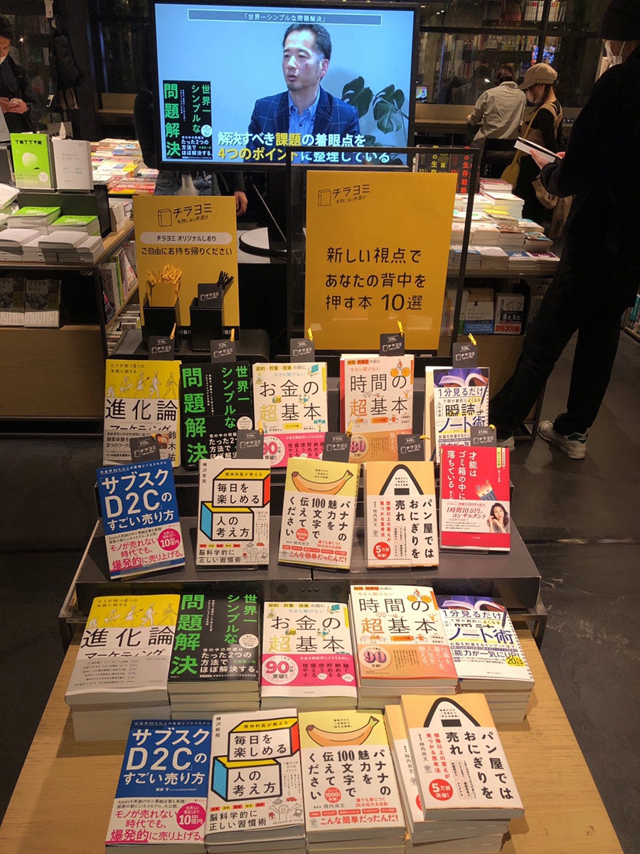 ビジネス書籍動画プラットフォームと蔦屋書店(TSUTAYA)様との取り組みで、約1ヶ月間、 東京・大阪の蔦屋書店 計6店舗でチラヨミフェアを開催中。