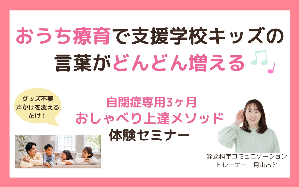 株式会社パステルコミュニケーション(本社:東京都豊島区、代表取締役吉野加容子)代表の吉野加容子が開発した、親子のコミュニケーションをスムーズにして子どもの発達を加速させる「発達科学コミュニケーション」講師・月山おとによる、「言葉が遅い支援学校キッズの言葉がどんどん増える♪自閉症専用3ヶ月おしゃべり上達メソッド無料体験オンラインセミナー」を開始しました。お申し込みはこちら<https://www.agentmail.jp/form/ht/55884/2/>