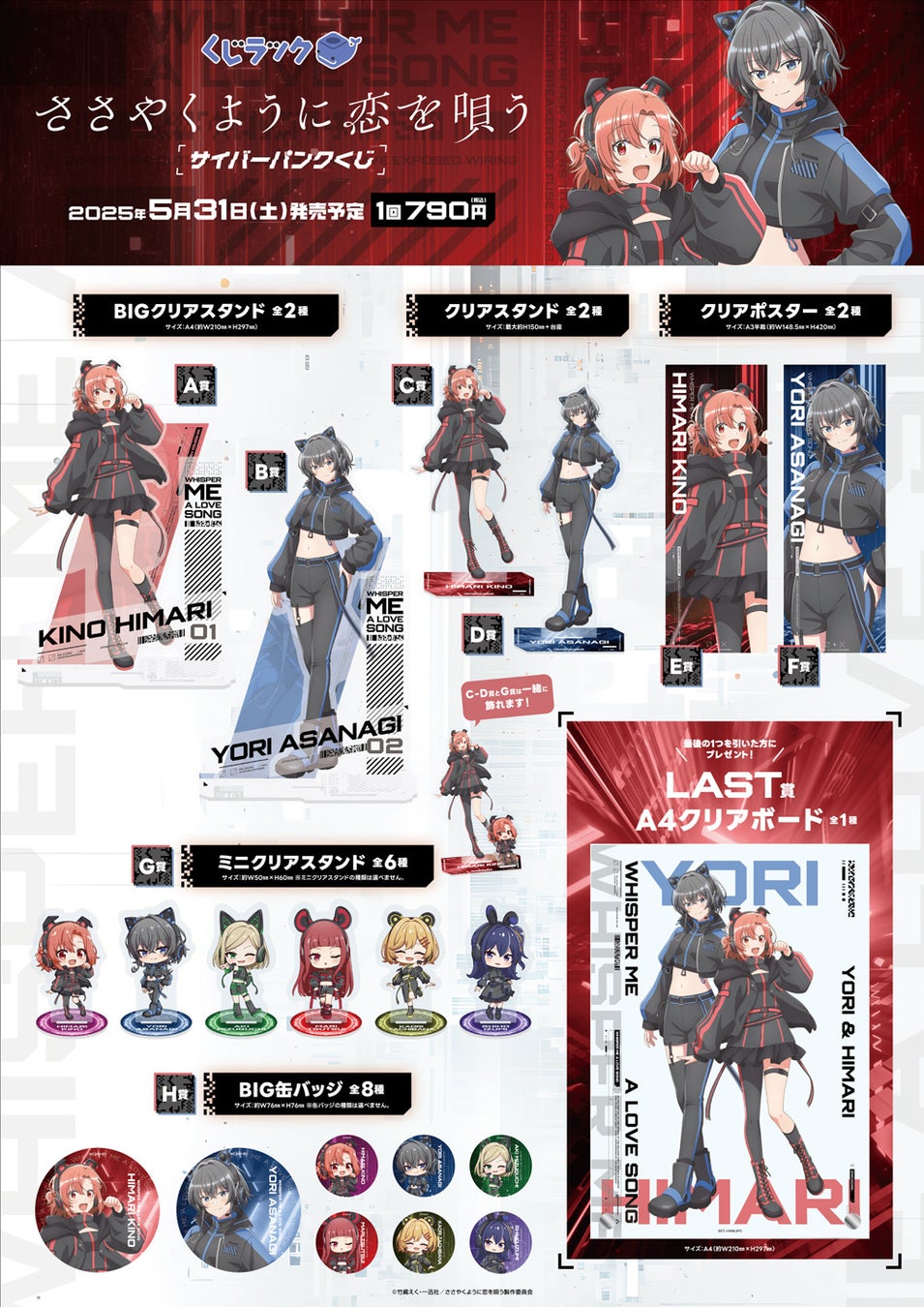 TVアニメ「ささやくように恋を唄う」のリアルくじ「くじラック」が5月31日より順次発売!サイバーパンク風の衣装をまとった、木野ひまり、朝凪依の描き下ろしイラストを使用したグッズがゲットできます。