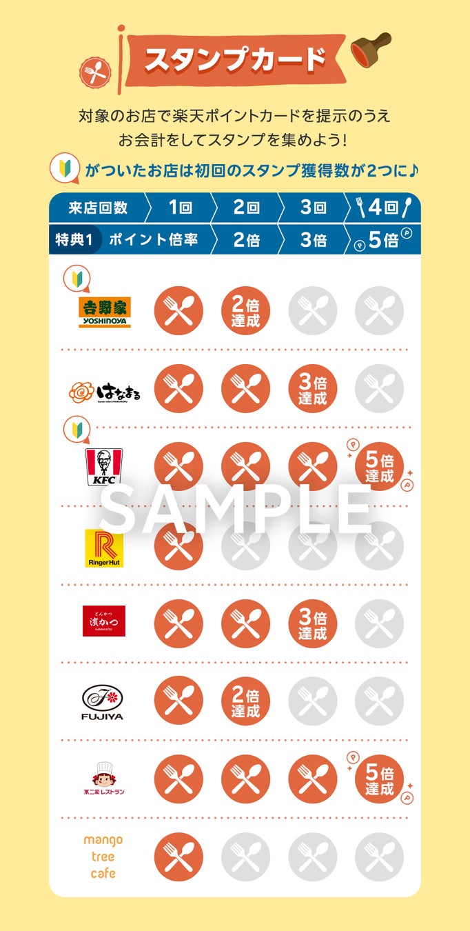 「楽天ポイントカード」が使える以下の各店舗 ※以下のお店の楽天ポイントカードが使える店舗は全て対象。 ・「吉野家」 ・「はなまるうどん」 ・「ケンタッキー・フライド・チキン」 ・「長崎ちゃんぽんリンガーハット」 ・「とんかつ濵かつ」 ・「不二家」 ・「不二家レストラン」 ・「マンゴツリーカフェ」 ※一部店舗では「楽天ポイントカード」を導入していません。 ※「楽天ポイントカード」の利用可否は店頭にてご確認ください。 ※「マンゴツリーカフェ」でのスタンプ押下は「マンゴツリーキッチン・ダンシングクラブ」での会計も対象となります。 |
