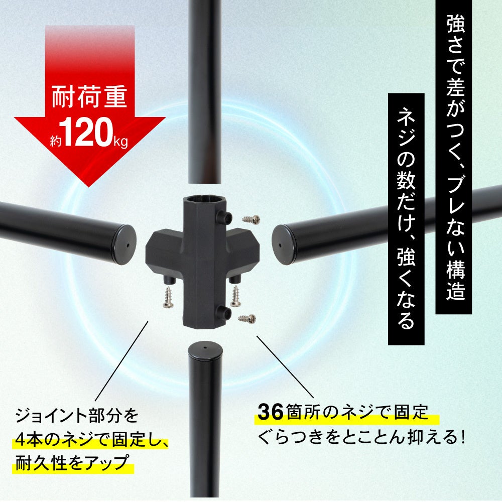 36箇所のネジでしっかりと固定する構造により、耐荷重約120kgを実現。各ジョイントには4本のネジを用い、ラック全体の剛性と安定性を高めています。重たいスタッドレスタイヤも安全に保管でき、グラつきにくい安心感を提供します。