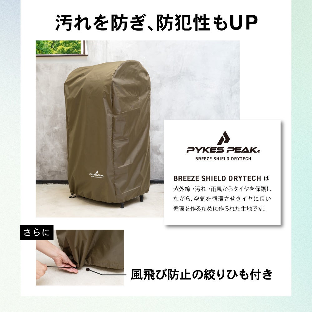 付属の専用カバーには、独自素材「BREEZE SHIELD DRYTECH」を採用。紫外線・雨・ホコリからタイヤを守るだけでなく、内部の空気循環にも配慮し、湿気による劣化を防ぎます。カバー下部には絞り紐を備え、風によるバタつきや盗難リスクも抑える設計です。