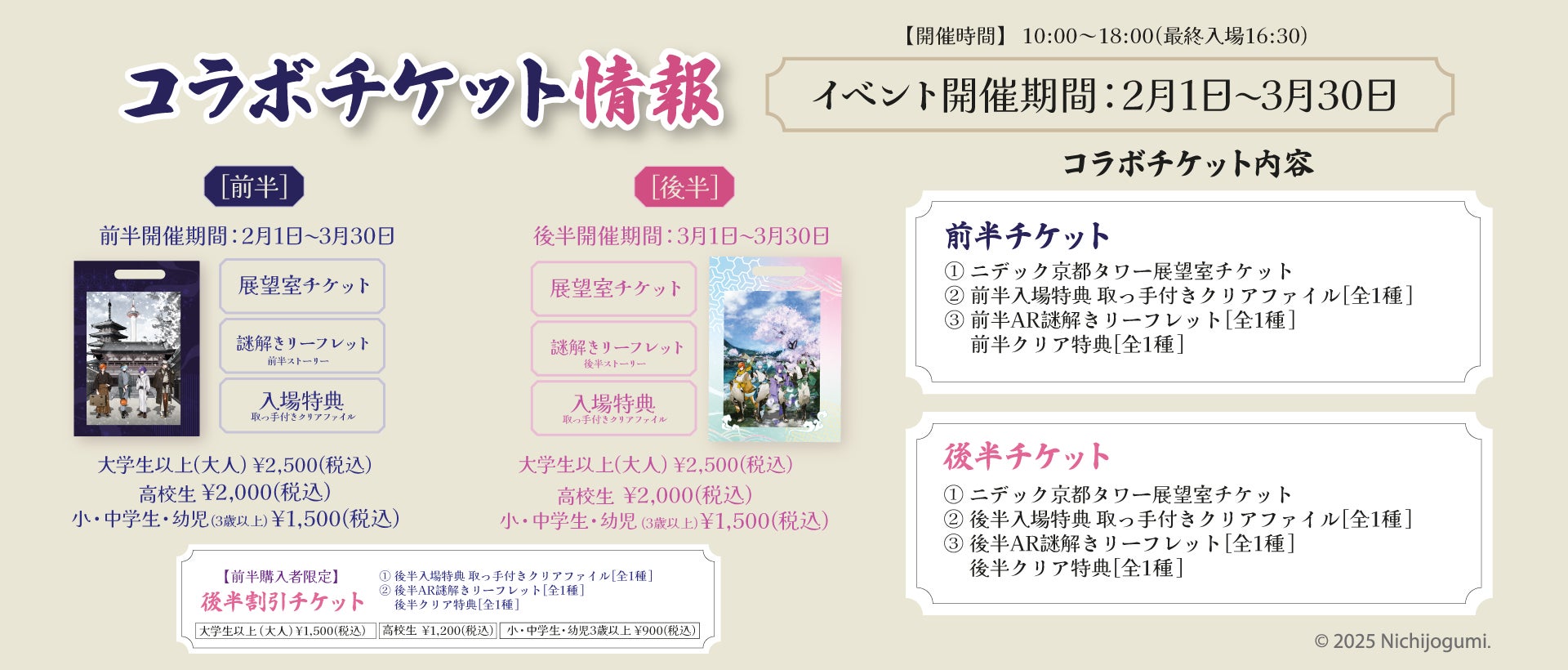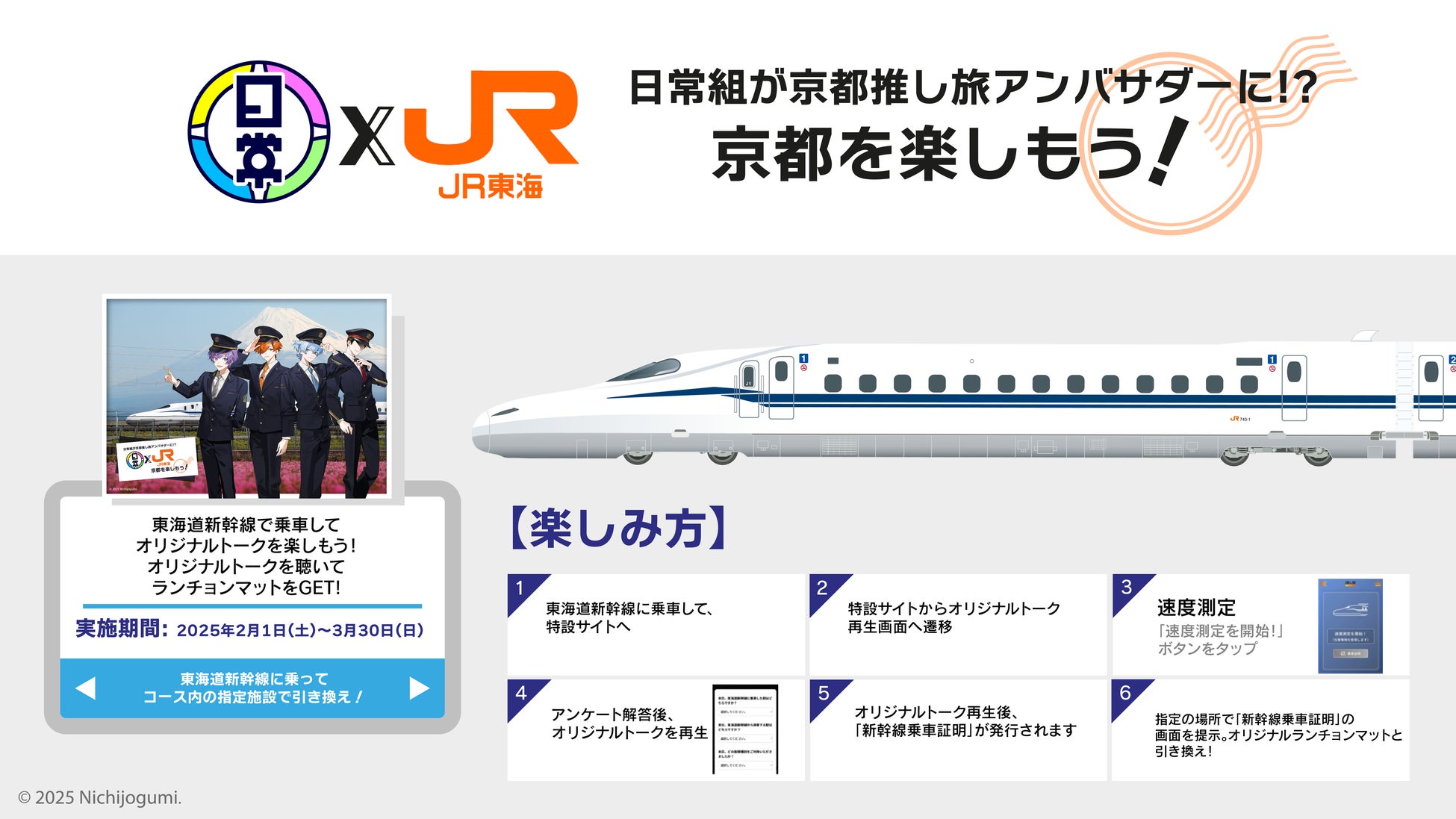 本イベントでは、ニデック京都タワー内において描き下ろしイラストを使用したオリジナルグッズの販売(事前注文制)や、等身大パネルを設置するほか、メンバーをイメージしたドリンクをお楽しみいただけるコラボカフェなどを実施いたします。さらに、日常組による人気動画シリーズ“羅生門”をモチーフとした、京都市内の社寺をめぐる周遊型謎解きイベントも同時開催。なお、開催期間の前半と後半でデザインや仕様の異なる特典なども登場し、メンバーとともに冬から春への季節のうつろいをお楽しみいただけます。また、「JR東海×日常組」のコラボレーションでは日常組が「京都推し旅アンバサダー」に就任し、メンバーの車内限定トークを聴きながら新幹線に乗車できるなど、冬の推し旅を盛り上げる様々なコンテンツを続々展開予定です。この機会にぜひ冬の京都旅をお楽しみください。