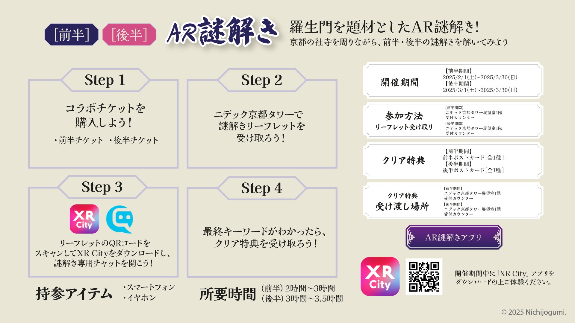 京都を代表する社寺を周遊しながら謎解き体験いただけます。なお、会期の前半と後半で会場となる社寺やストーリーは変わります。謎解きでは、「株式会社NTTコノキュー」が提供する新感覚街あそびARコンテンツ「XR City」を使用し、スマートフォン・タブレットでXR体験ができるものです。「XR City」をダウンロードした端末を所定の場所にかざすと、リアルとデジタルが融合した「便利・おトク・楽しさ」をARで体験いただくことができます。