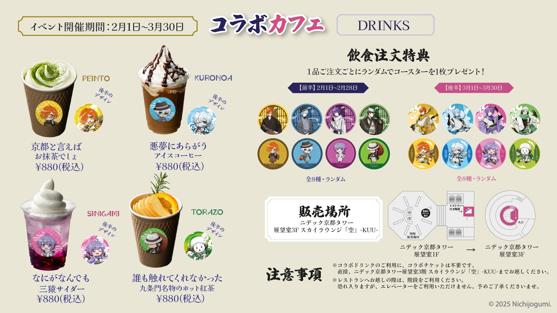 ニデック京都タワー内 展望室3階の「スカイラウンジ「空」 -KUU-」にて、コラボカフェを開催いたします。メンバーをイメージしたドリンク4種類を販売いたします。1品ご注文ごとにランダムでコースターを1枚プレゼント。なお、会期の前半である2月1日(土)~28日(金)と、3月1日(土)~30日(日)で特典の図柄が変更となります。また、ドリンクはテイクアウトでもご提供いたします。