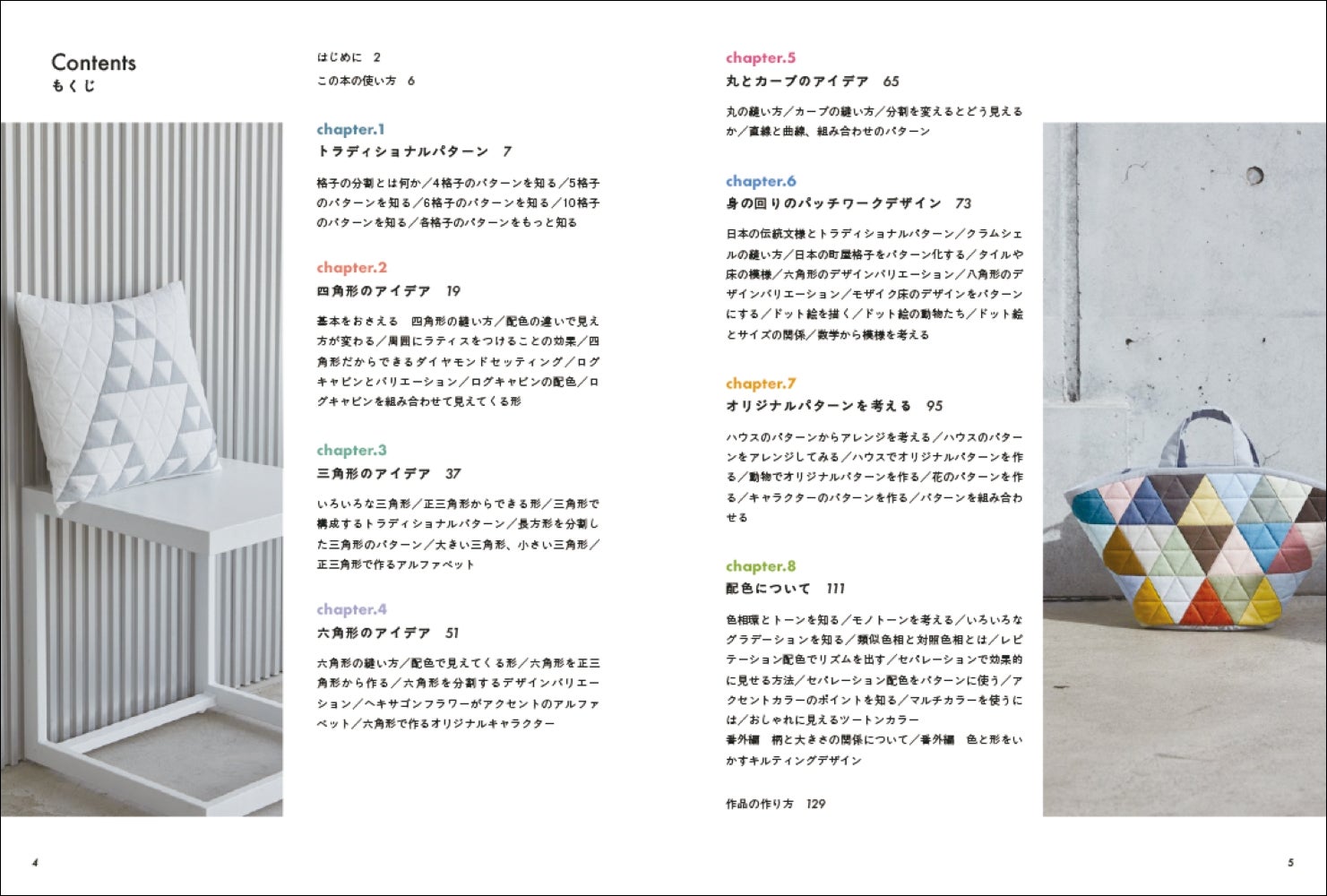オリジナルデザインを考えることができるようになるまでの、考え方やアイデア、ヒントを盛り込みました。デザインは難しいと思われがちですが、いきなり自由なデザインを描くのではなく、パッチワークパターンの基本となる格子(グリッド)から考えることでわかりやすくなります。布を使ってデザインするパッチワークは布の色や柄、質感が大きく関係するので、たくさんの作品と実際に縫った布のパターンを見せてイメージしやすく、解説が一目でわかるように工夫しています。感覚だけで合わせる人が多いですが、理論や方法を知ることで感覚の裏付けとなり、デザインや色合わせができるようになります。基本から、応用から、 配色からと、どこから読んでも楽しめ、作品作りのヒントになる1冊です。