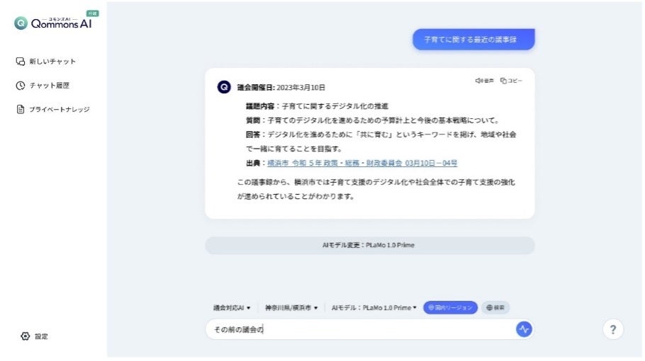 今回、コモンズAIにPLaMo Primeを標準搭載することで、日本語の理解力と生成精度が向上し、法令や条例などの専門性が高い文書作成や、行政特有の複雑な問い合わせへの対応精度が高まり、行政課題の迅速な解決や政策立案の質の向上に大きく貢献することが期待されます。