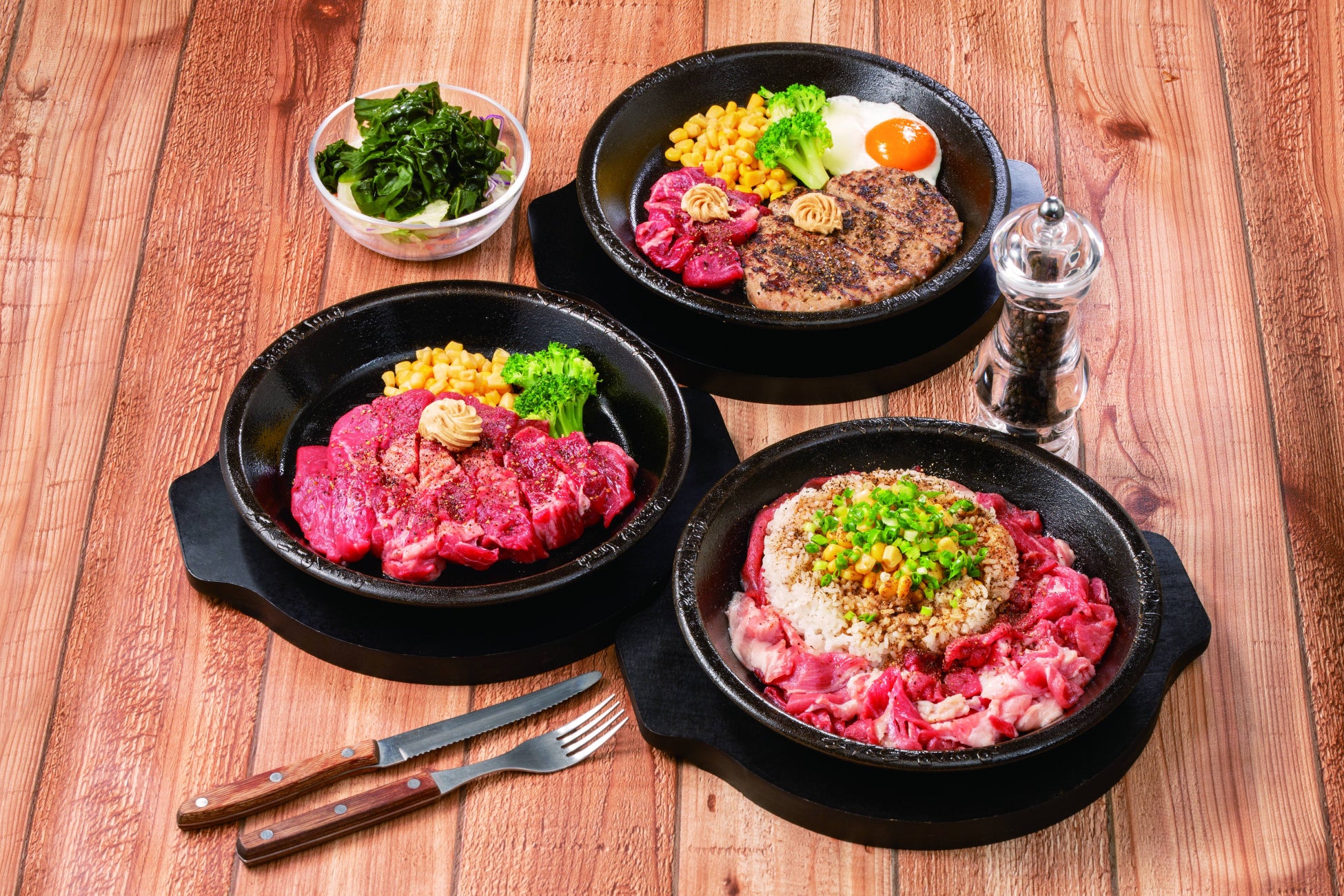 “あつあつ”の鉄皿にのったステーキ、ハンバーグ、ペッパーライスをお客様自ら焼き上げ、