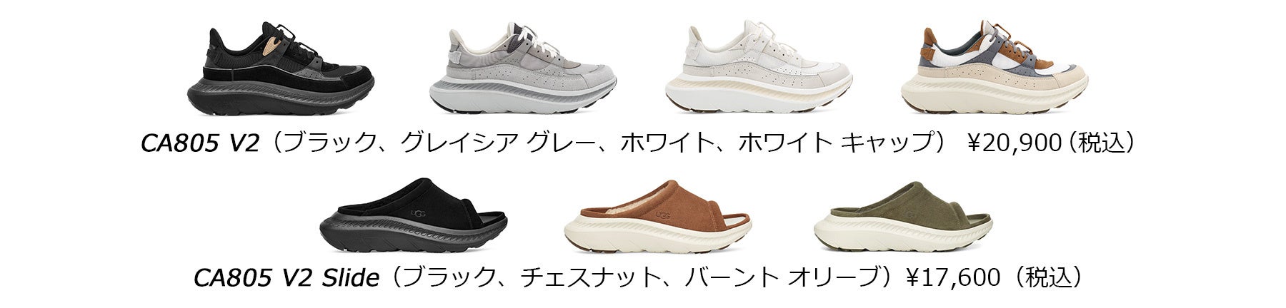 Tokyo ( 2022年2月25日) – 南カリフォルニアを拠点とするグローバルライフスタイルブランドのUGG (a division of Deckers Brands [NYSE: DECK])は、2月に新モデルとして発売を開始したCA805 V2スニーカーコレクションから、メッシュ・レザー・スウェードのコンビネーションからなるCA805 V2スニーカーの新作と、同サンダルシリーズのCA805 V2 Slide(スライド)を3月2日(水)より新発売します。オールジェンダー対応のサイズレンジで、使用されているテキスタイルの内、30%~50%はリサイクルポリエステルを使用することで環境にも配慮したコレクションです。着地時から高いクッション性と共に安定性をもたらすよう設計された新開発のTreadlite by UGG™のアウトソールは、異なる硬度のフォームを組み合わせ、正確な屈曲ポイントを促すシャンク・Dynamic Support Platformを内部に搭載する事で、着地から蹴り出しまでスムーズな足運びをもたらしてくれる至高の1足。中敷きには高衝撃吸収性と共に圧縮に対して高い復元性を発揮するウレタンフォームPORONのインソールを搭載。ソールと組み合わせることで、より高次元の快適性をもたらします。アッパーは、後足部から前足部にかけてのリフレクターパーツや、前足部と中足部に配した補強パーツがシューレースホールと連動し、靴ひもを締めると同時に高いホールド感をもたらすため、長時間の歩行でも安全で安定性も高い高機能スニーカーです。CA805 V2 SlideはCA805 V2と同じソールで、スウェードのアッパーとライニングに7mmのUGGplush™を使用したスライドサンダルです。