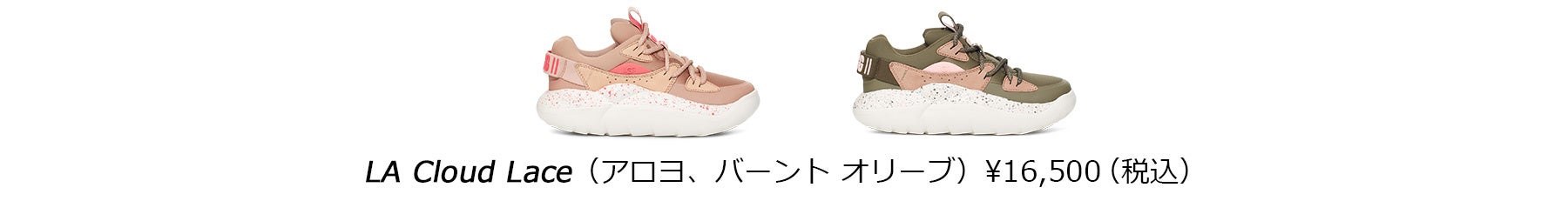 軽くて弾むような履き心地と丸いフォルムが大人気のLA Cloud(LA クラウド)シリーズのスニーカー、LA Cloud Lace(LA クラウド レース)にはピンクとカーキを基調とした新色が登場。テキスタイルのアッパーにスエードのオーバーレイ、メッシュライニング、クッション性の高いTreadlite by UGG™(トレードライト バイ アグ)のアウトソールに、太めのレースや踵にロゴを施したストラップが目を引くスニーカーです。