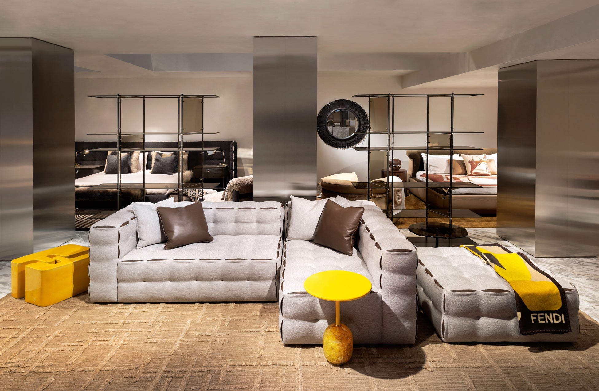 「フェンディ カバー(FENDI Cover)」は、やわらかく、より丸みを帯びた形状を持つソファで、「フェンディ カーサ」のクリエイティブチーム「FFデザイン(FF Design)」によりデザインされました。このソファは、衣服を着替えたり、アクセサリーを変えるようなファッションのコンセプトが特徴となり、カジュアルな場面にも洗練された場面にも完璧に調和します。ここでは、さまざまなファブリック、レザー、カラー、そしてディテールがフェンディのアイコニックなコードを美しく表現しています。レザーは、クッションの厚さをつくる重要な要素となっており、アンダースカートにも使用されています。直線的なトーン・オン・トーンのオプションから、豊かなカラーパレットの象徴的な「ペカン」のスパイラルまで、パイピングの選択もスタイリッシュな要素の一つになります。
