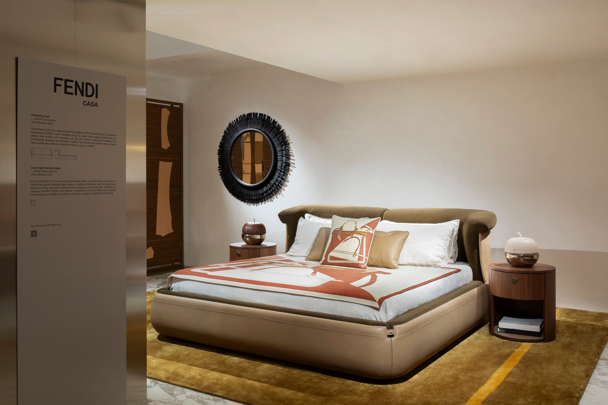 これらの新作に加え、既存のプロダクトラインにも多数の製品が追加されています。ヨナス・ファン・プット(Jonas van Put) による「ルナー(Lunar)」コーヒーテーブルは、ダイニングテーブルバージョンとベッドサイドテーブルの発売により小規模なシリーズとなりました。アトリエ・オイ(atelier oï)による「アーチーズ(Arches)」 テーブルには新しい形状と素材が用いられています。「ブラード(Blurred)」コンソールをベースにした小さなテーブルがローンチされる一方で、同じベルトバックルディテールがあしらわれたサイドテーブルが、トアン・グエン(Toan Nguyen)による「ソーホー(Soho)」ソファをベースに考案されています。コントロヴェント コレクティブ(Controvento Collective)による、アイコニックな「ピーカブー(Peekaboo)」 バッグにインスパイアされた「ピーカシット(Peekasit)」シーティングシステムから、「ピーカスリープ(Peekasleep)」というベッドが登場し、専用のブランケットと組み合わせることができます。アトリエ・オイによる「ファン フェンディ(Fun Fendi)」シリーズのベッドは、よりワイドでより包み込むデザインや、または高さのあるデザインのヘッドボードが特徴です。