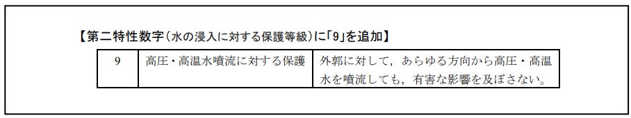 水の浸入に対する保護等級を表す第二特性数字に、従来の最高等級であった保護等級「8」を超え、「高圧・高温水噴流」に対する保護等級「9」が導入されました。これにより、過酷な環境で使用される機器の性能をより正確に評価・表示することが可能になります。