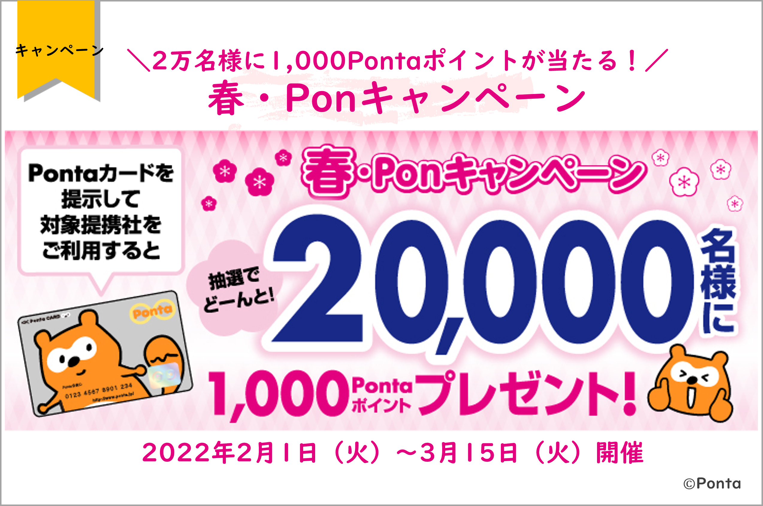 2万名様に1,000Pontaポイントが当たる! 「春・Ponキャンペーン」2022年2月1日(火)~3月15日(火)開催