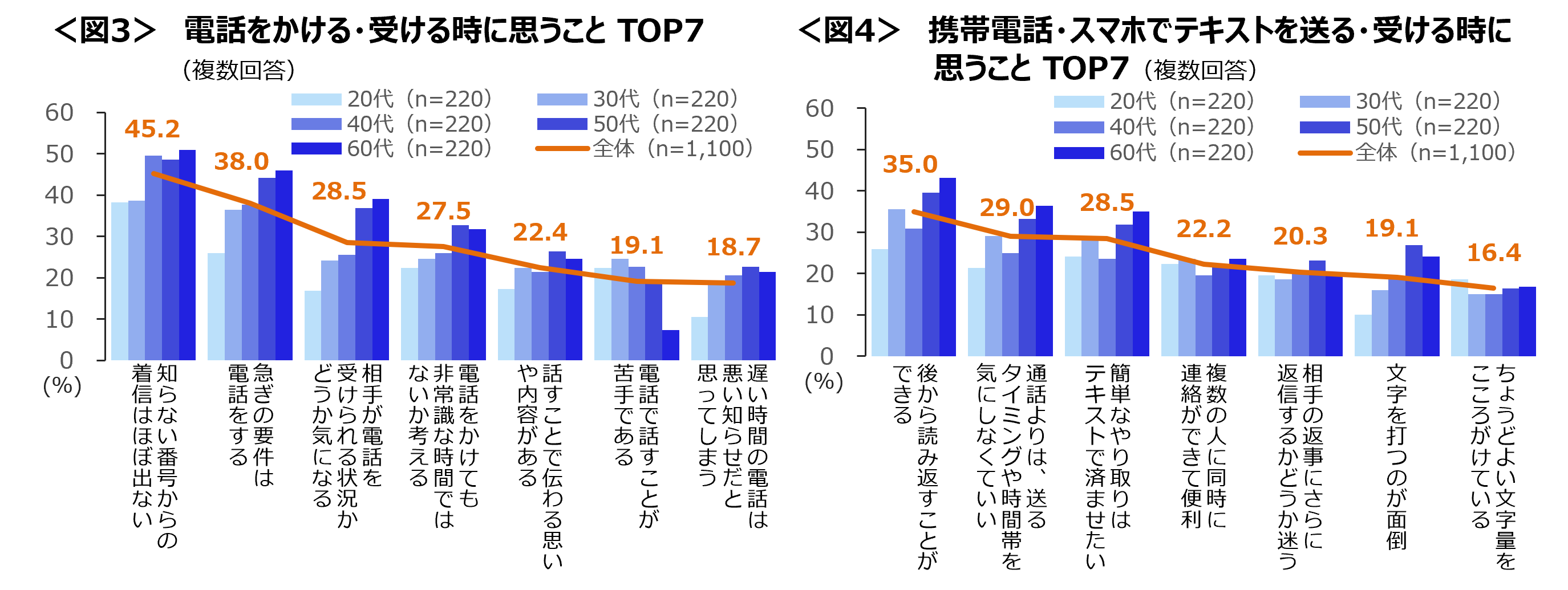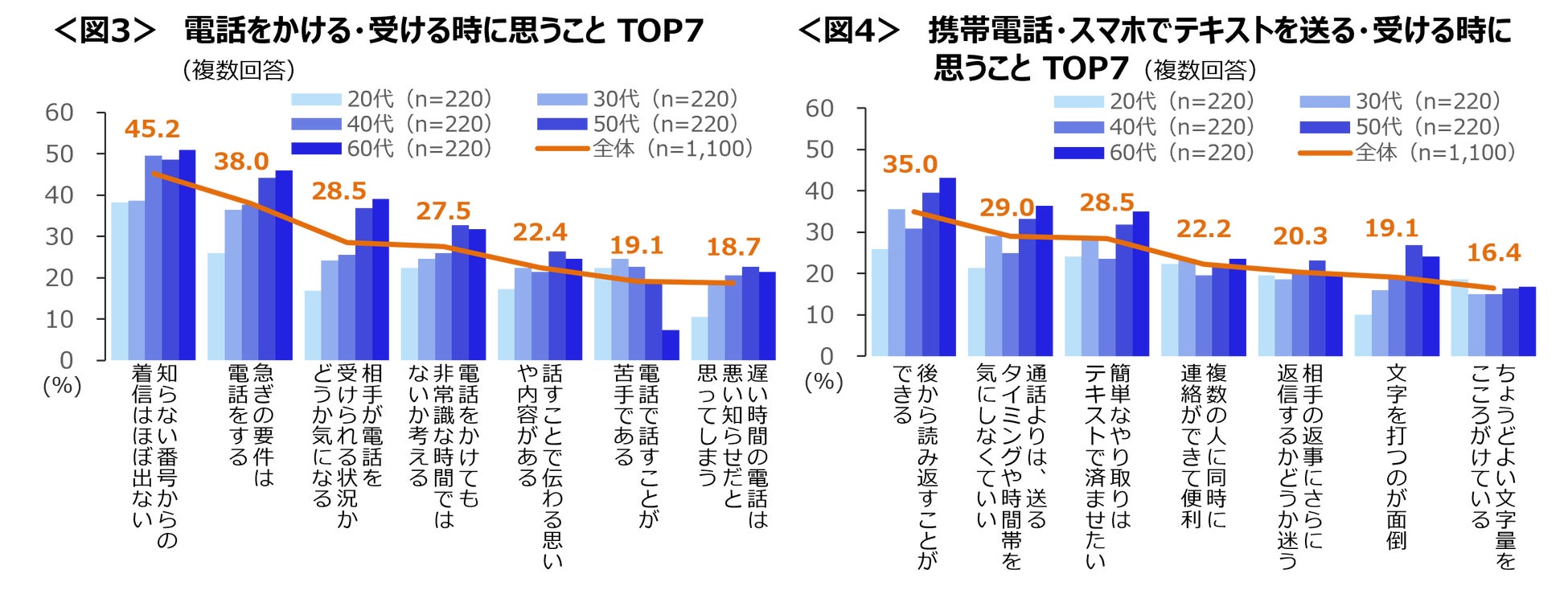 特に50~60代は「後から読み返すことができる」「通話よりは、送るタイミングや時間帯を気にしなくていい」「簡単なやり取りはテキストで済ませたい」「文字を打つのが面倒」が高め。<図4>