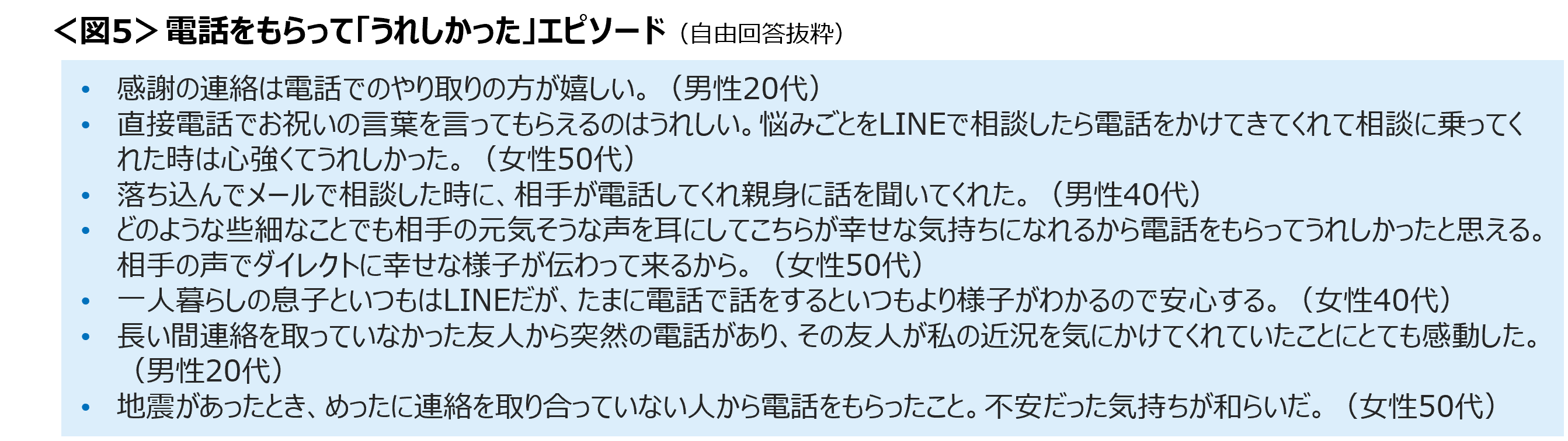電話をもらって「うれしかった」エピソードは、お祝いやお礼を伝えられたことに関するコメントが多くあがった。普段あまり連絡をとっていない人から久しぶりに電話があり喜ばしく感じたという声もみられた。<図5>