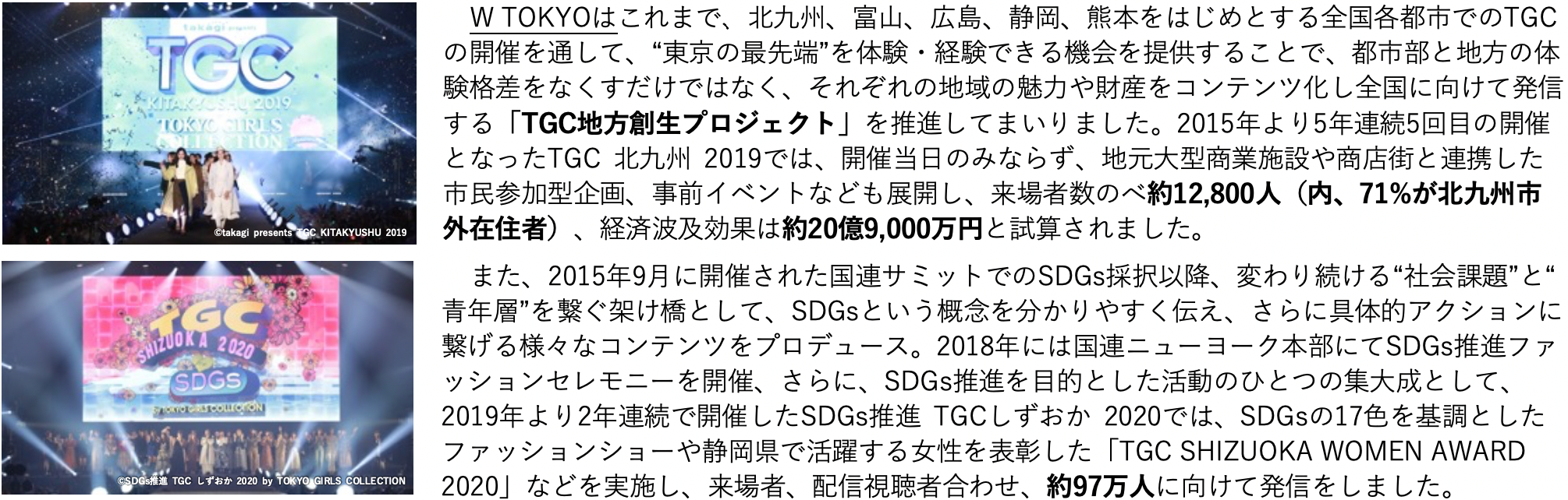 W TOKYOは、TGCを活用した地方創生に取り組むとともに、変わり続ける社会課題と青年層をつなぐ架け橋として、2015年の国連総会における「持続可能な開発のための2030アジェンダ」(以下、SDGs)採択以降、長きに渡り、SDGsをエンターテイメントの力で分かりやすく伝える取り組みを実施して参りました。その取り組みの一環として、日本を代表するエンタテインメントカンパニーで、エンタテイメントを通じた社会貢献に積極的に努めてられているLDH JAPANさんとパートナーシップを組み、全国各地で開催されるTGCの場を活用し、ダンスをはじめとするエンタテインメントと自治体とのコラボレーションを通じた、地域社会への貢献、SDGsの推進を目指すプロジェクトを展開しております。