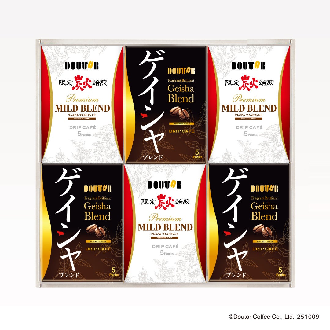 また、11月1日(土)よりご注文承りを開始する「冬ギフト」では、プレミアムマイルドブレンドを使用したギフトセットを複数ラインナップいたします。ドトールのこだわりが詰まった、「ドリップカフェ プレミアムマイルドブレンド詰合せ20袋入り」やプレミアムマイルドブレンドとゲイシャブレンドを詰合せた「ドリップカフェ2種詰合せ30袋入り」を数量限定でご用意しました。