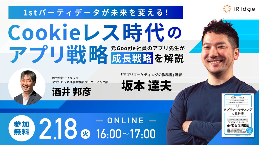 株式会社アイリッジ(本社:東京都港区、代表取締役社長:小田 健太郎、東京証券取引所グロース:3917、以下「アイリッジ」)は、2025年2月18日に経営者・マーケティング担当者向けオンラインセミナー「1stパーティデータ※1が未来を変える!Cookieレス時代のアプリ戦略~元Google社員のアプリ先生が成長戦略を解説~」を開催することをお知らせします。