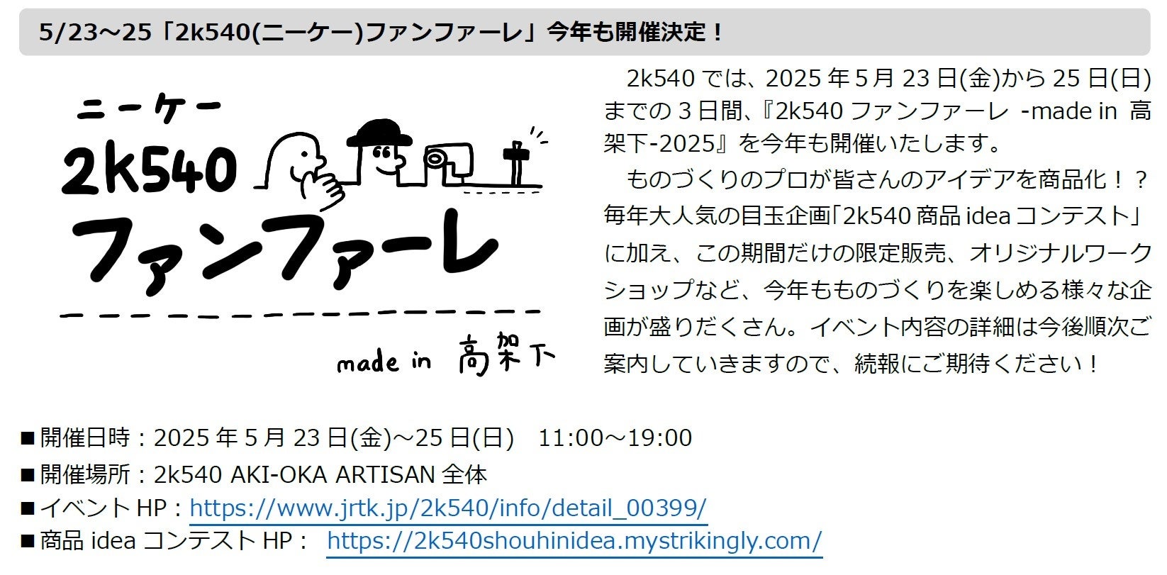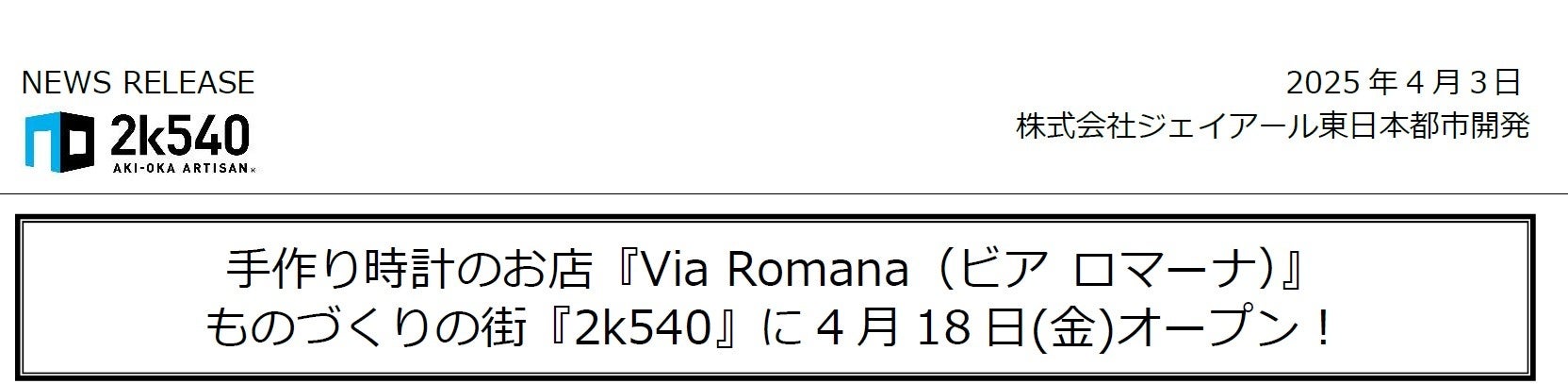 JR秋葉原駅と御徒町駅間の鉄道高架下に位置する、“日本のものづくり”をテーマにした商業施設『2k540 AKI-OKA ARTISAN(ニーケーゴーヨンマル アキオカ アルチザン)』にて、手作り時計のお店『Via Romana(ビア ロマーナ)』が2025年4月18日(金)11時に新規オープンいたします。