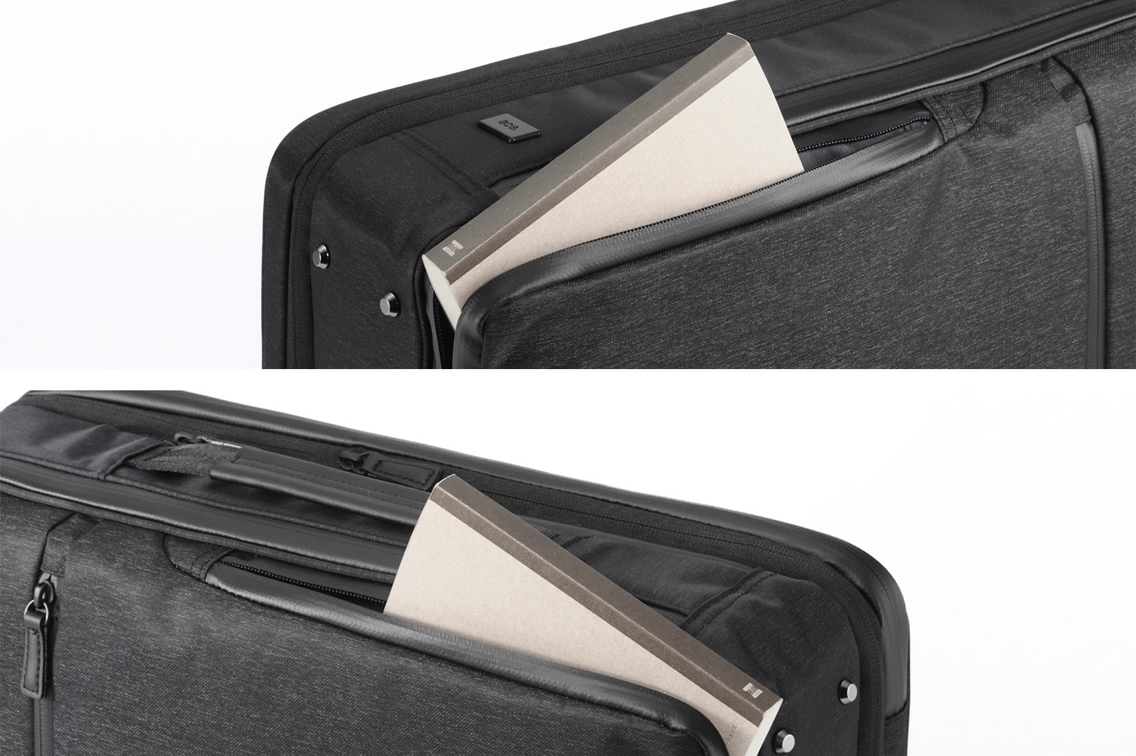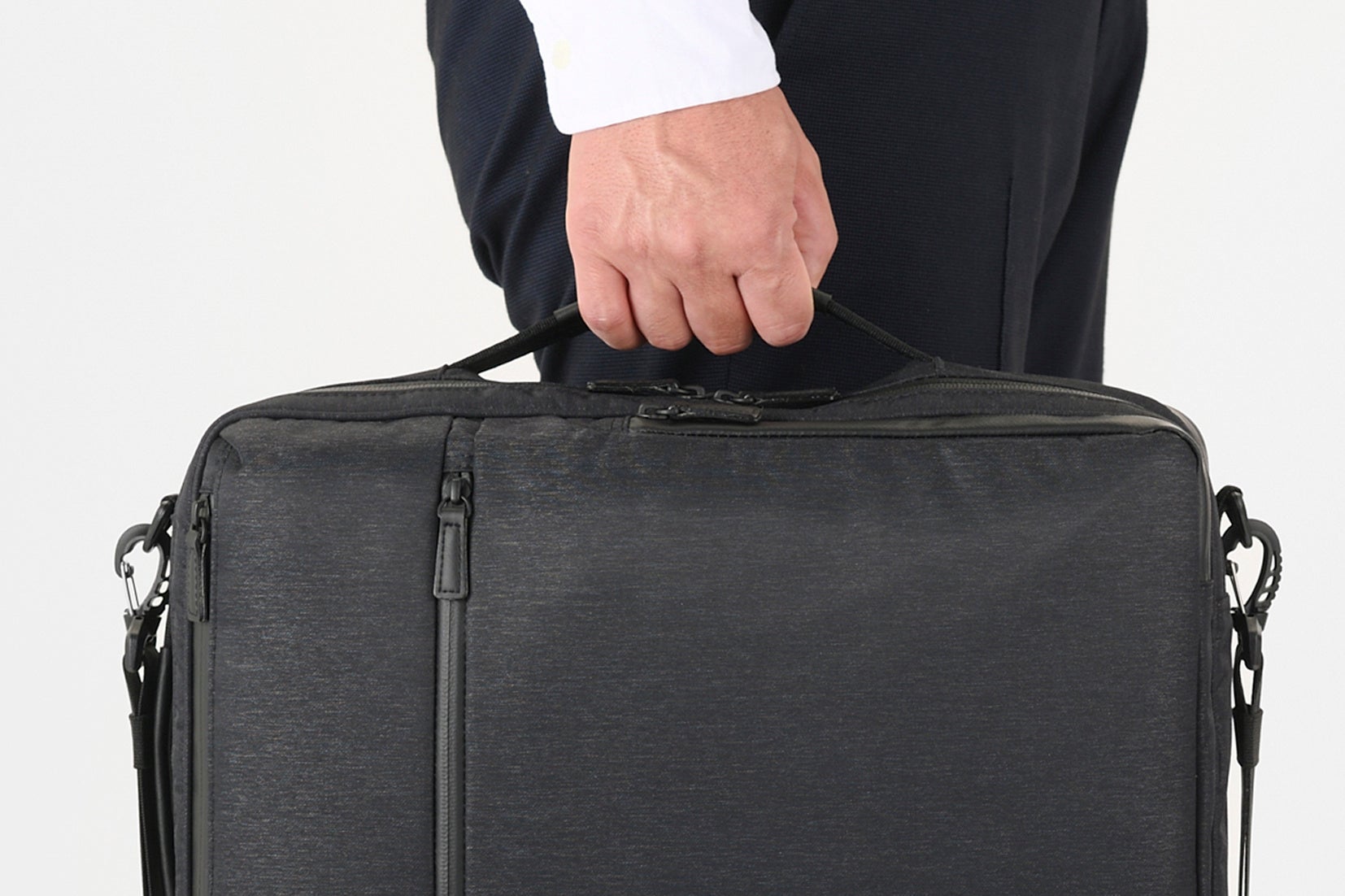 「手に持つ」時はトップハンドル、「棚に上げる」時はサイドハンドルやベルト簡易収納機能、「前に抱える」時は縦・横どちら向きで抱えても取り出しやすい位置にファスナーやポケットを配置しました。