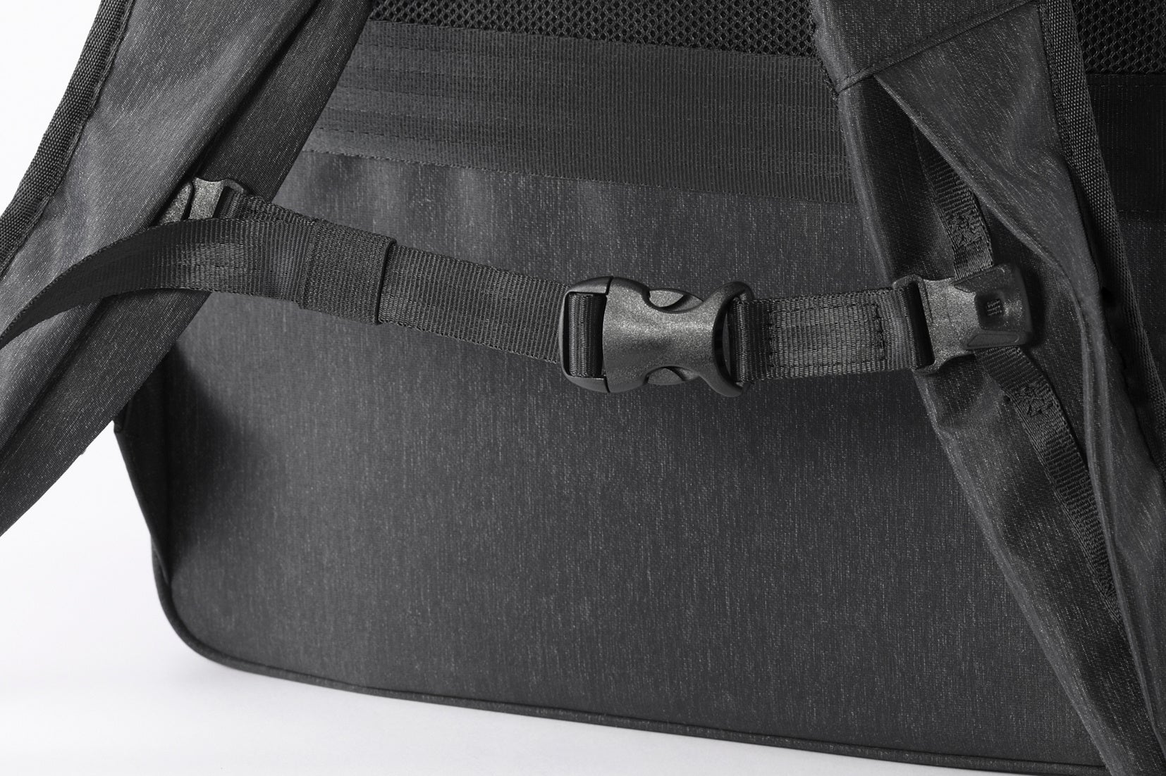 フィット感を高める「可動式チェストベルト」を、位置調節部が見えないすっきりとしたデザインに変更。