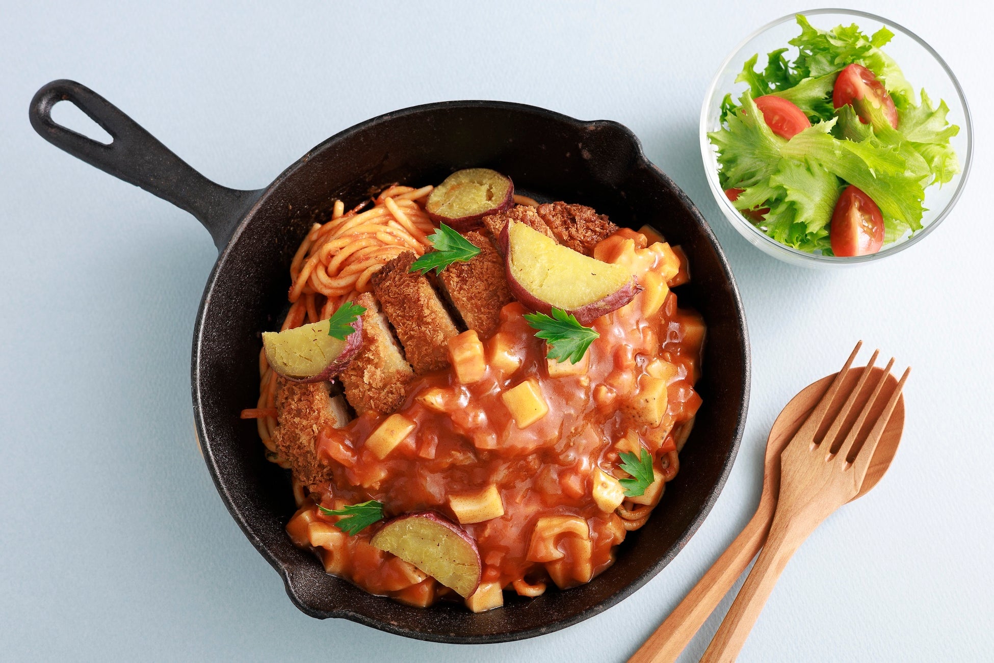 スパゲティの上にトンカツとたっぷりのミートソースがかかった釧路のソウルフード「スパカツ」を徳島風にアレンジ。ミートソースに徳島県のみそと阿波鶏を使用し、コク深い味わいに仕上げました。
