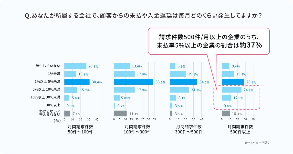 月間請求件数と未払い率の関係を見ると、請求件数が増えるほど未払いが常態化し、500件以上の企業では約37%が“未払い率5%以上”と回答しました。