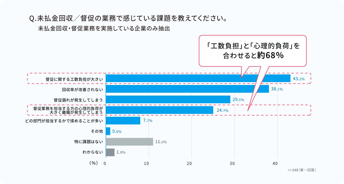 督促業務で感じる課題として、工数負担(43.2%)と心理的負担・離職(24.7%)が計約68%を占めました。