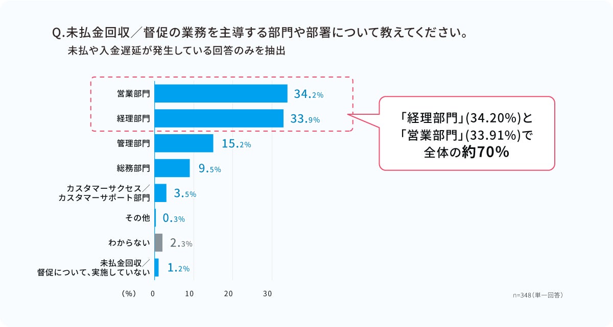 未払い金回収・督促を主導する部署は、経理(34.2%)と営業(33.9%)で計約7割を占めました。