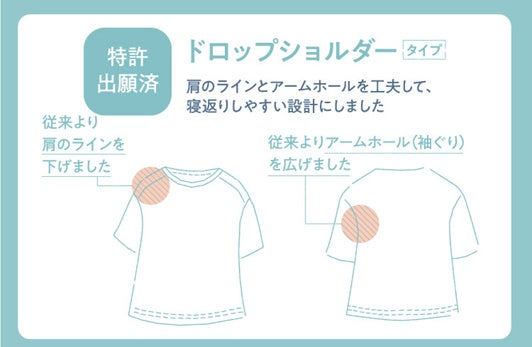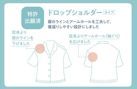 パジャマとルームウェア。肩のラインとアームホールの設計を工夫したドロップショルダ―設計で背中・肩・腕を