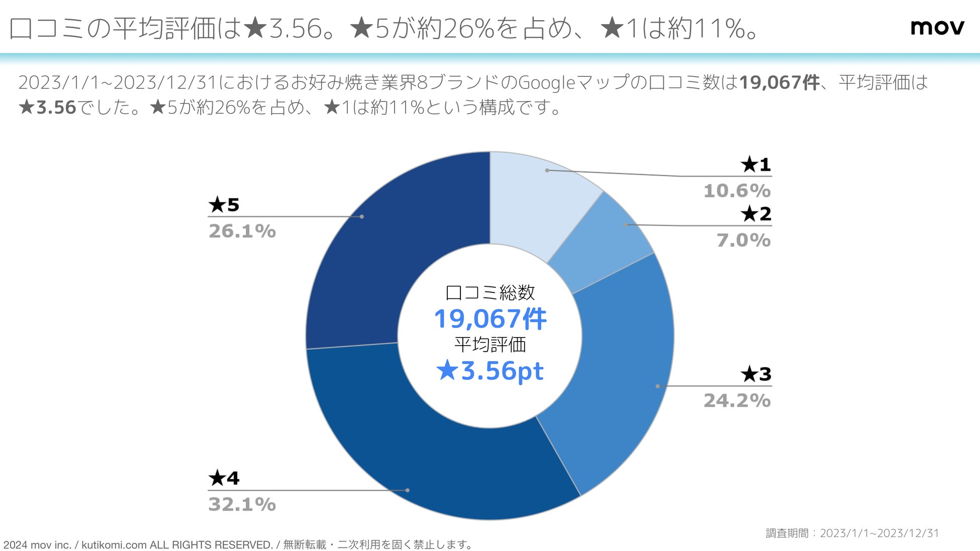 2023/1/1~2023/12/31におけるお好み焼き業界8ブランドのGoogleマップの口コミ数は19,067件(うちレビューあり:10,755件)、平均評価は★3.56でした。★5が約26%を占め、★1は約11%という構成です。