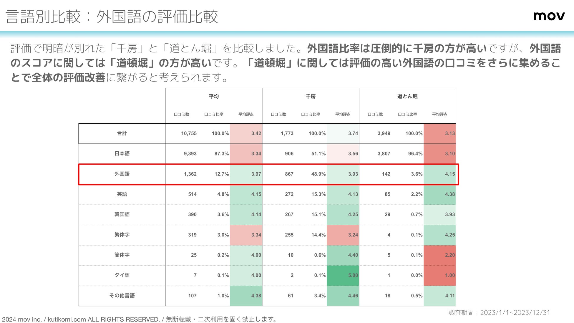 2023/1/1〜2023/12/31における日本語平均評価が★3.34に対し、外国語平均評価は★3.97となり、他業界同様に外国人は日本人よりも高い評価をつける傾向があるようです。