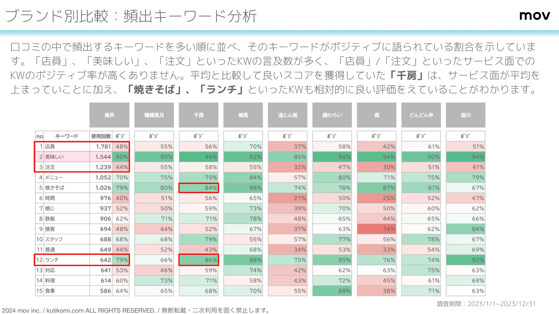 平均と比較して良いスコアを獲得していた「千房」は、サービス面が平均を上回っていることに加え、「焼きそば」、「ランチ」といったKWも相対的に良い評価を得ていることがわかります。