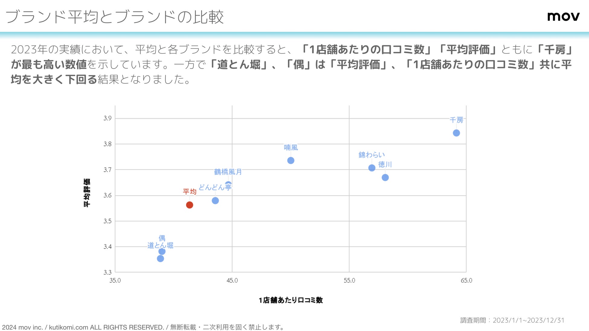 2023年の実績において、平均と各ブランドを比較すると、「1店舗あたりの口コミ数」「平均評価」ともに「千房」が最も高い数値を示しています。