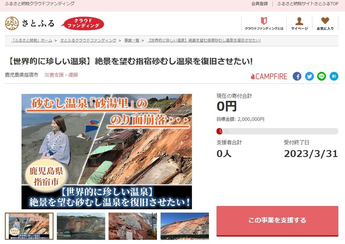 事業名:【世界的に珍しい温泉】絶景を望む指宿砂むし温泉を復旧させたい!