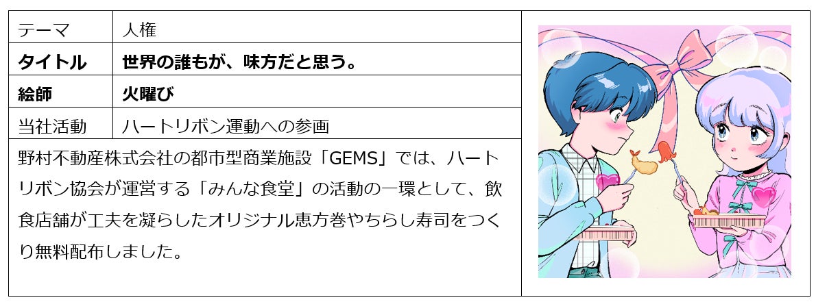 ダイバーシティ&インクルージョンがテーマで、「みんな食堂」を舞台に男の子と女の子がお弁当を分け合ったり食べさせ合っているイラストを描かせていただきました。