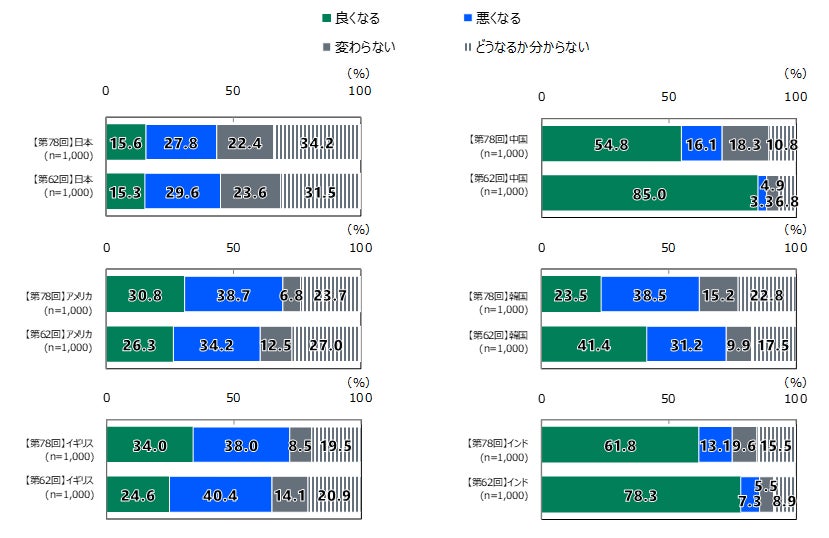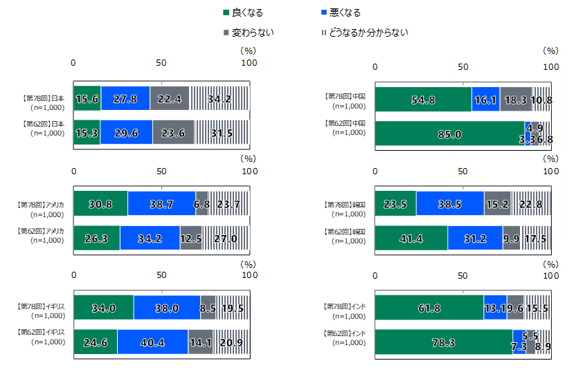 「自国の将来」に関しては「良くなる」がインド、中国で過半数を超えてはいるものの、残る4カ国は「悪くなる」が上回っています。とはいえ、そのインド、中国に加え韓国でも「良くなる」の割合は減っており、特に中国は約30ポイント減少しています。日本は16%と前回から微増したものの今回も最下位。ちなみに19年に行った第20回9カ国調査で「良くなる」と答えた日本の若者は9.6%、「悪くなる」の約4分の1でした。