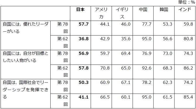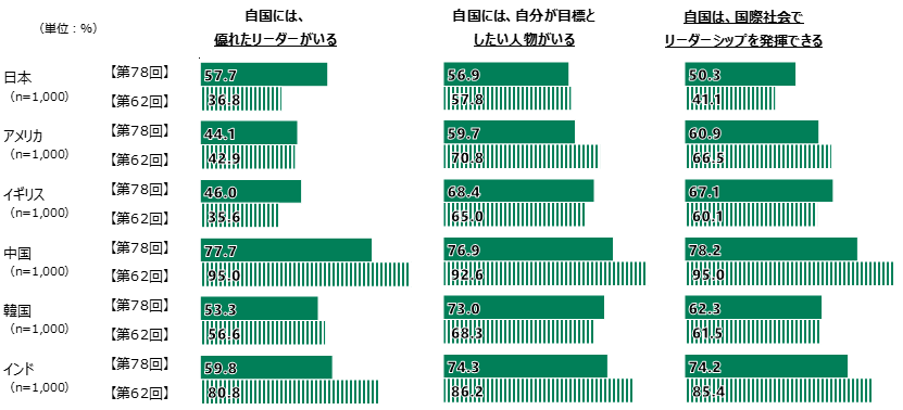 「自国の現状」では「優れたリーダーがいる」に同意する回答が日本は60%弱とアメリカ、イギリス、韓国より高く、前回調査結果を約20ポイント上回っています。「自国は、国際社会でリーダーシップを発揮できる」も上昇していますが、他の5カ国に比べると10~20ポイント低い数字に留まっています。