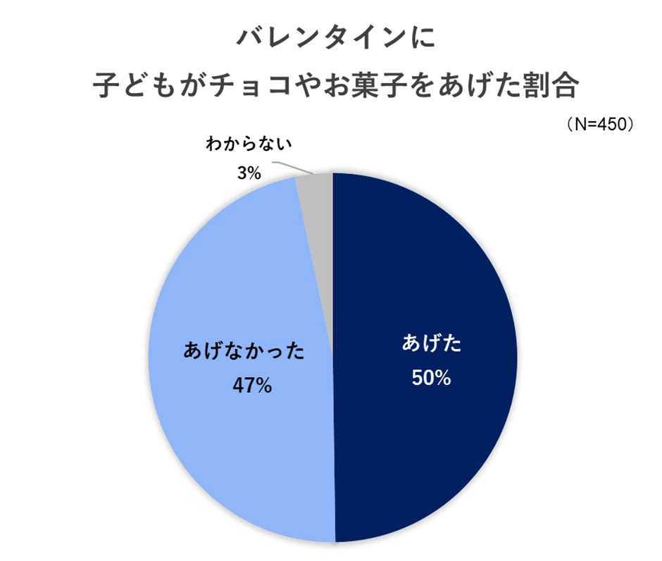 「あげた」が50%で「あげなかった」が47%、「わからない」が3%で、約半数の子どもが昨年(2024年)のバレンタインに、お菓子やチョコをあげたという結果でした。