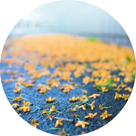 雨上がり、やわらかな土に散りばめられた星のような花のかけら。初秋の午後、金木犀の小径。