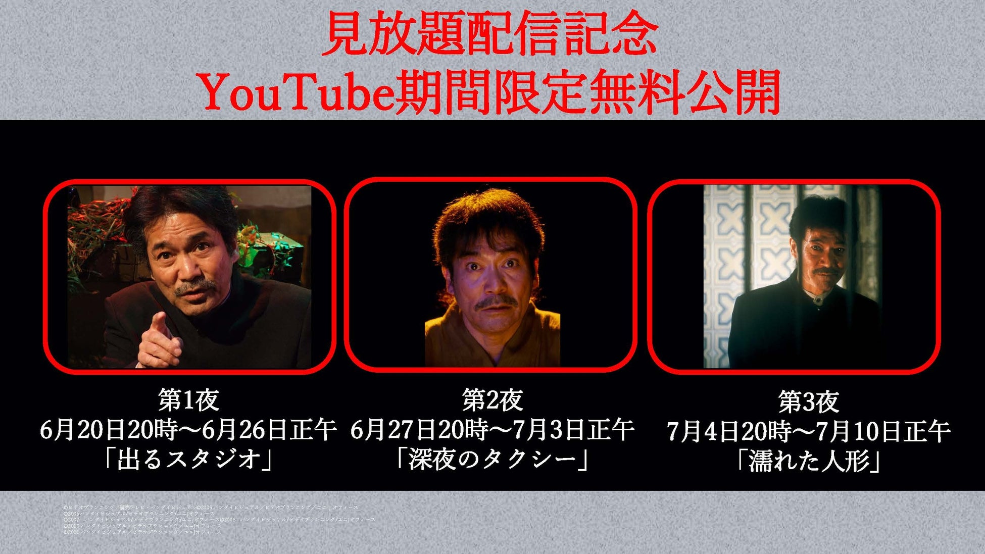 2025 年6 ⽉20 ⽇より毎週⾦曜⽇20 時〜、見放題配信タイトル計105話の中から、「出るスタジオ」、「深夜のタクシー」、「濡れた人形」の3話を、YouTube「EMOTION Label Channel」にて期間限定で順次無料配信します。