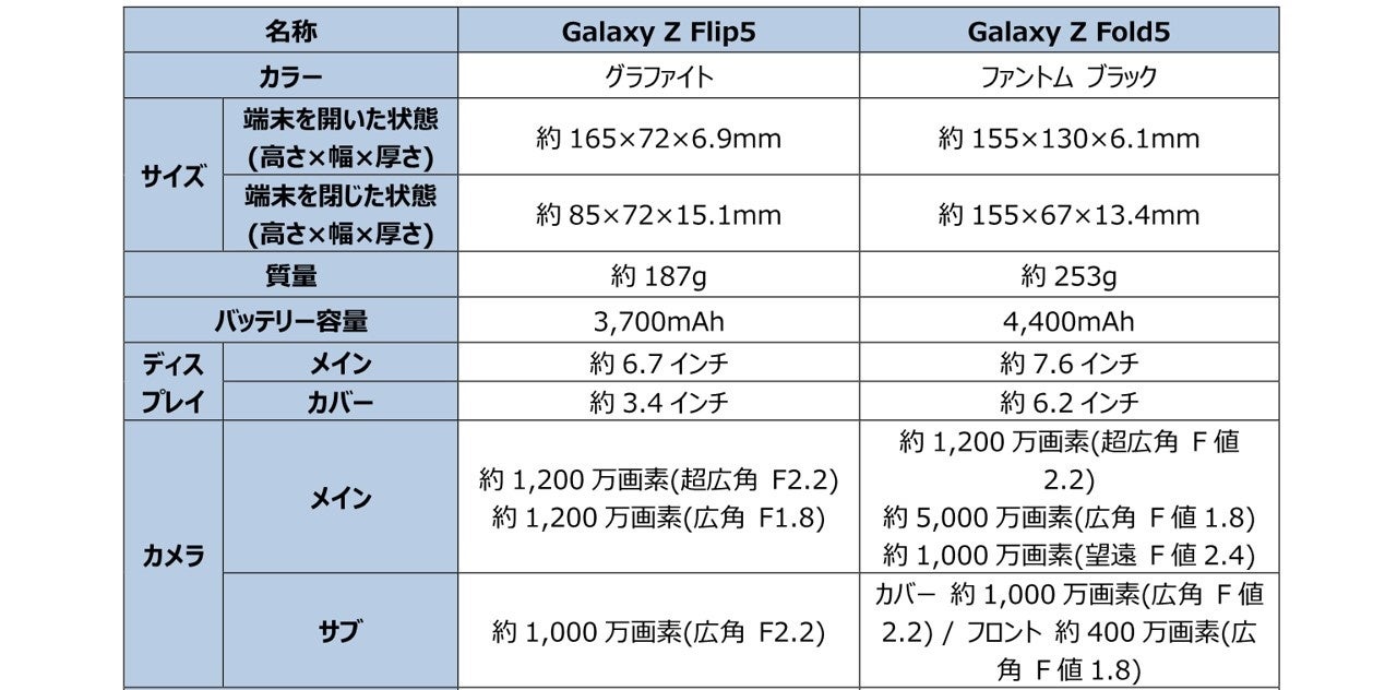 <主な仕様:「Galaxy Z Flip5」および「Galaxy Z Fold5」>