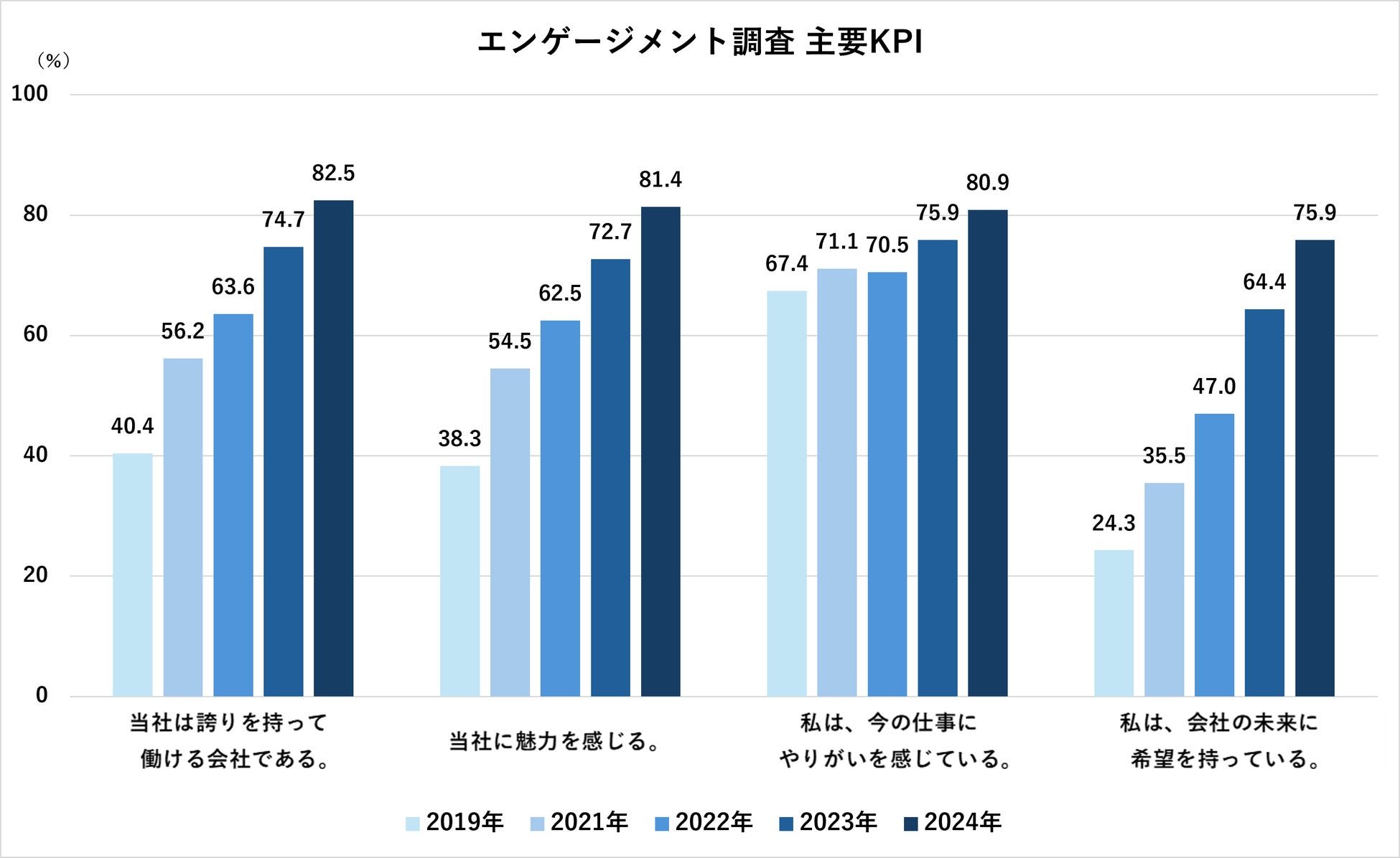 当社では売上高、営業利益、ROEに加え、従業員エンゲージメントスコア(会社に対する誇り)を経営の重要指標の一つとして掲げ、毎年従業員を対象に調査を実施しています。2024年度の結果は昨年より7.8%上昇し、過去最高となる82.5%となりました。また、主要KPIとして定めている自社の魅力、仕事に対するやりがい、会社の未来に対する希望についてもそれぞれ昨年から5%以上上昇し、過去最高を記録しました。