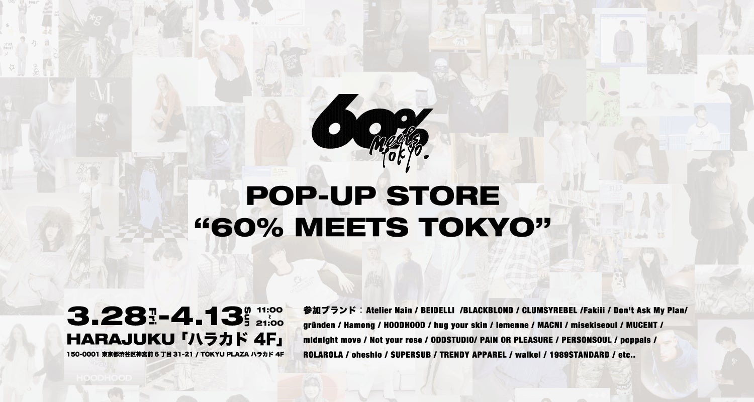 2000以上のアジア各国で話題のブランドが集まるオンラインセレクトストア「60%(シックスティーパーセント)」が、3月28日(金)〜4月13日(日)の期間中、TOKYU PLAZA ハラカドでポップアップを開催いたします。